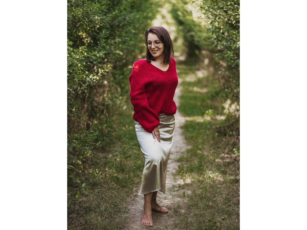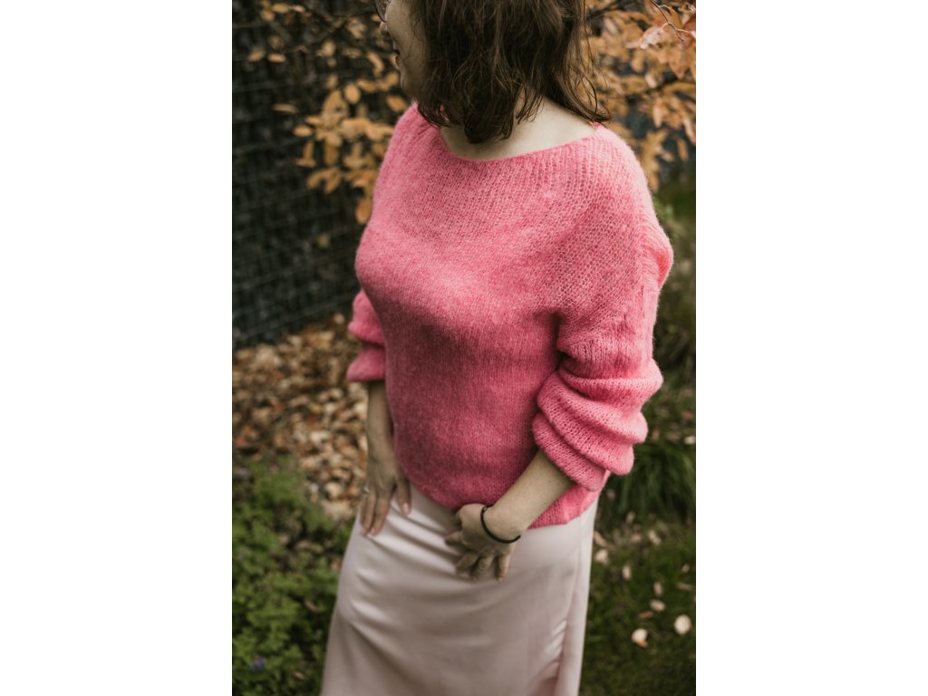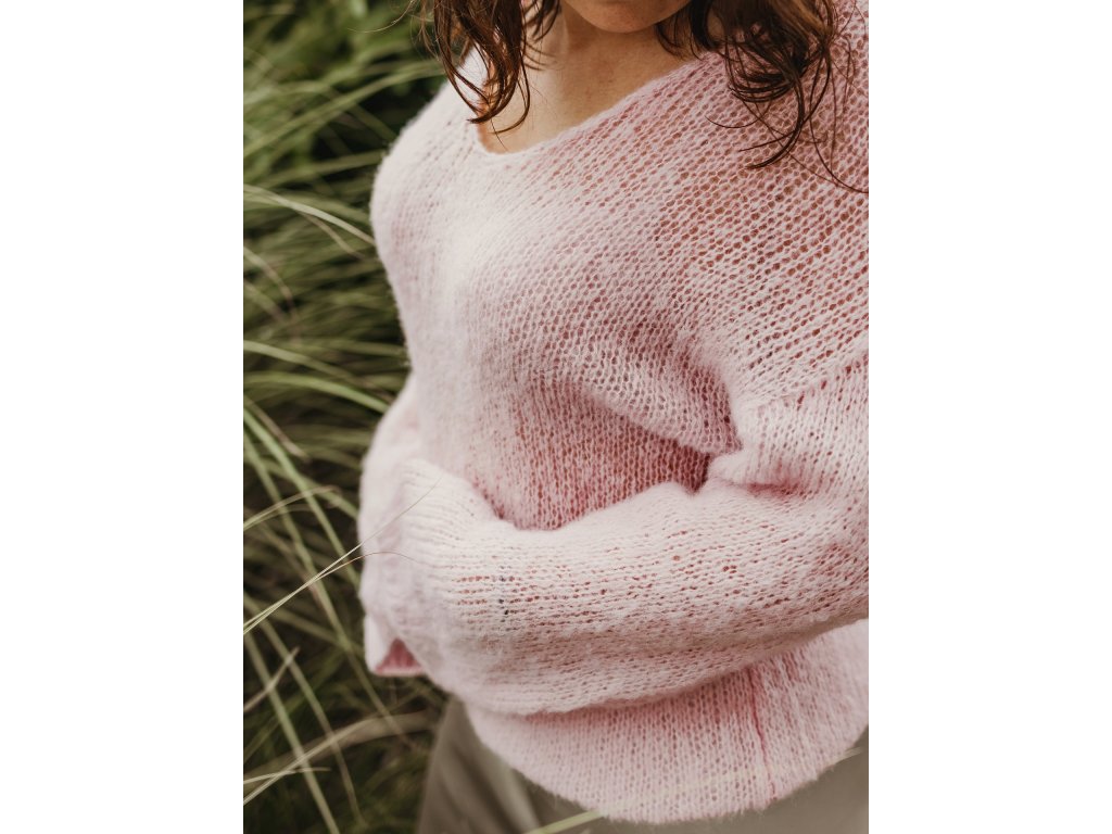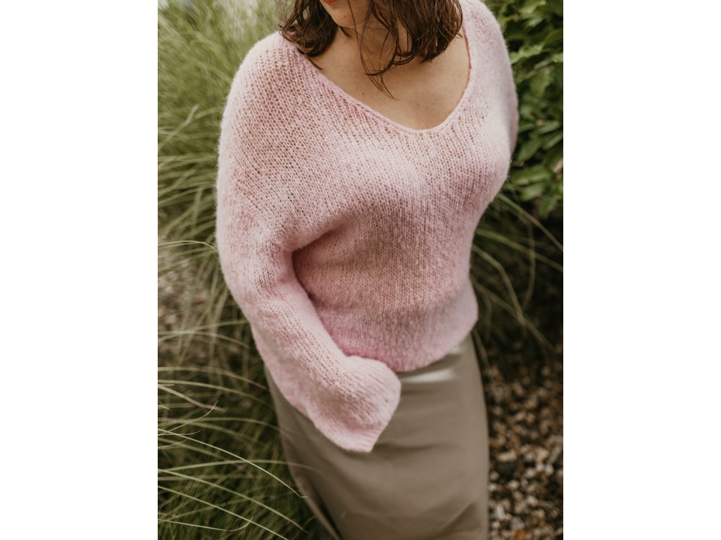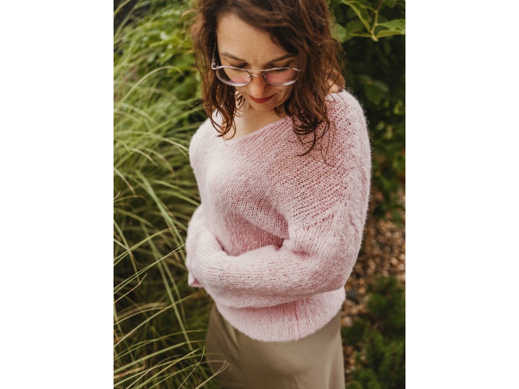 Tento svetřík je ručně pletený z jemné alpaky v kombinaci s hedvábím. Působí lehce a vzdušně, jeho struktura může na první pohled vypadat jemně „dírkovaná“, ale nenechte se zmást protože právě alpaka dodává příjemné teplo a hřejivost. Díky tomu je svetřík lehký na těle, a přesto zahřeje, když je potřeba.